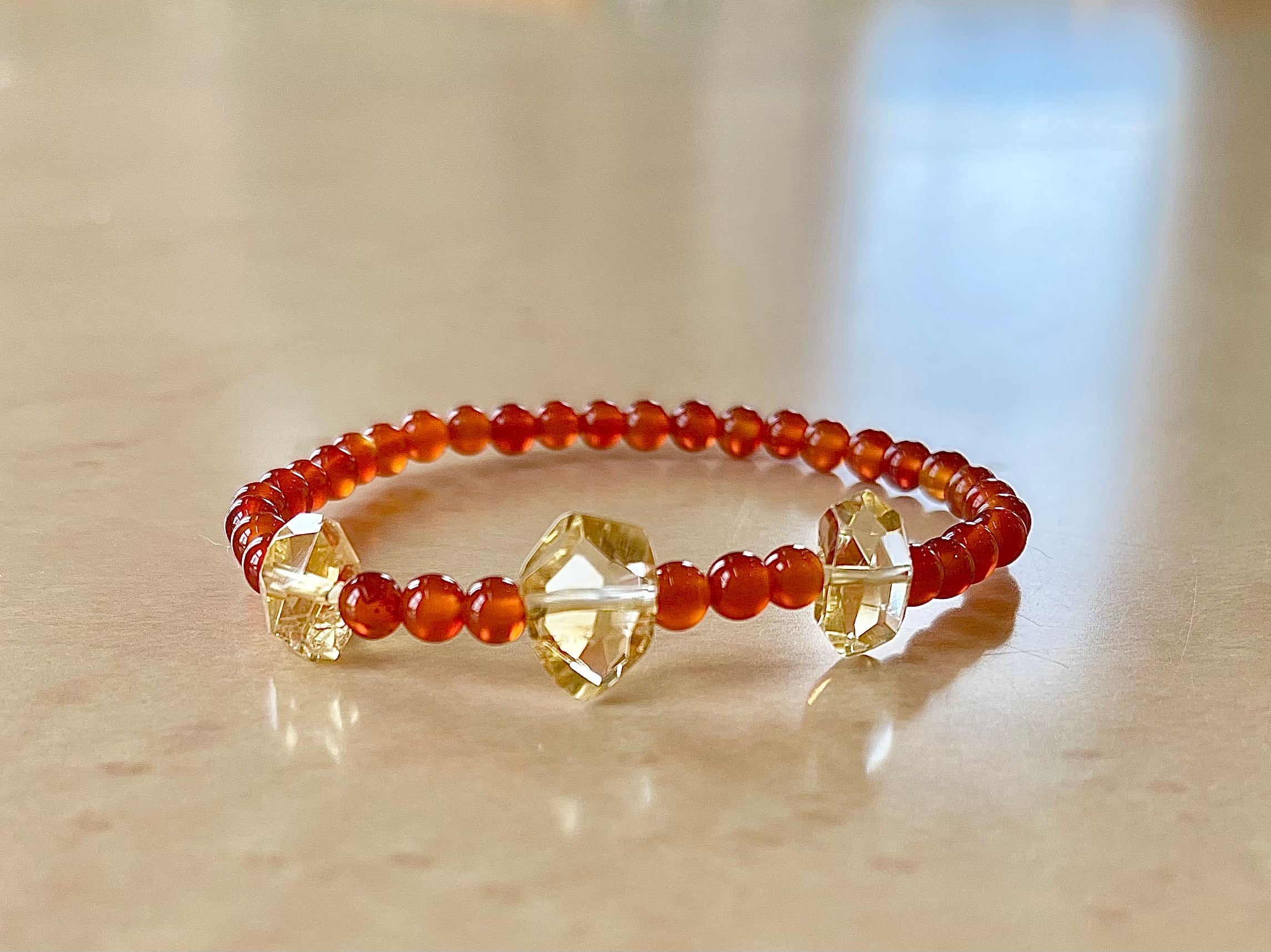 石の意味:カーネリアンは行動力や自己肯定感を高める石とされ、持つことで自信を与え、意欲を引き出します、元気つけ、健康良く。シトリンは豊かさと成功を象徴し、心を豊かに保つ力があります、金運と人間関係よく、ストレスの緩和。