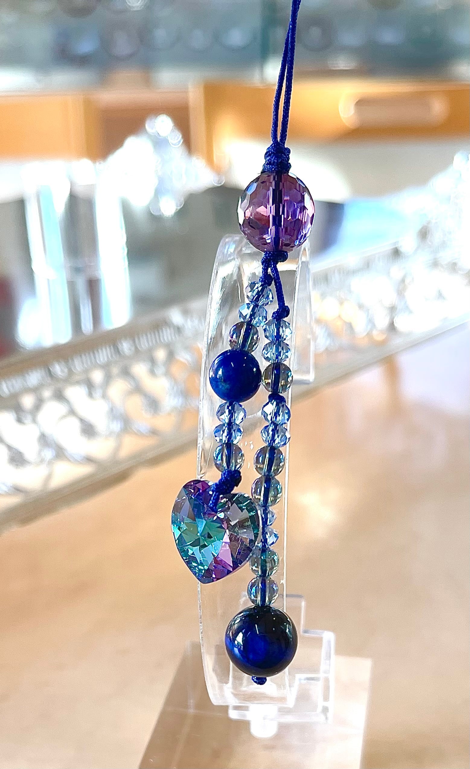 深みのあるブルー系の石に、カットガラス瑠璃のキラキラとした輝きが加わり、見た目もとっても可愛い仕上がりに。