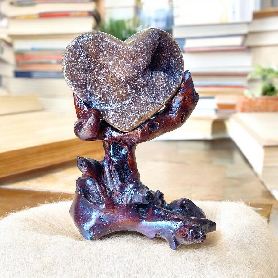 美しい結晶が輝くハート型のトレジャーメノウを、自然木の台座にあしらった存在感ある一品です。