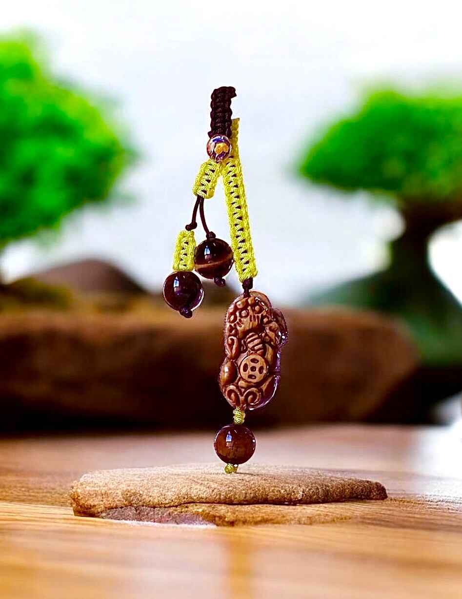 このキーホルダーは、古くから財運を招くとされる伝説の神獣「貔貅(ひきゅう)」と、洞察力や決断力を高めるとされるパワーストーン「タイガーアイ」が美しく融合した逸品です。