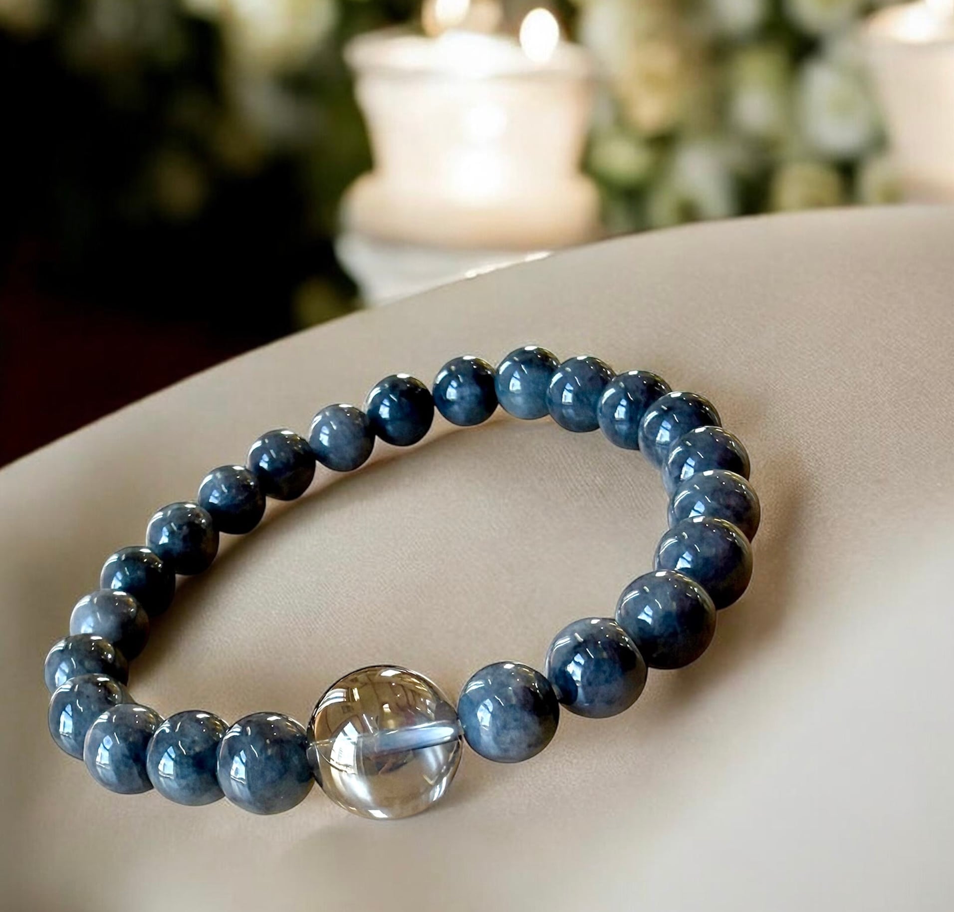 落ち着いた灰色の翡翠と、輝きを放つシルバーオーラ水晶を組み合わせた、力強く上品なお守りブレスレット。