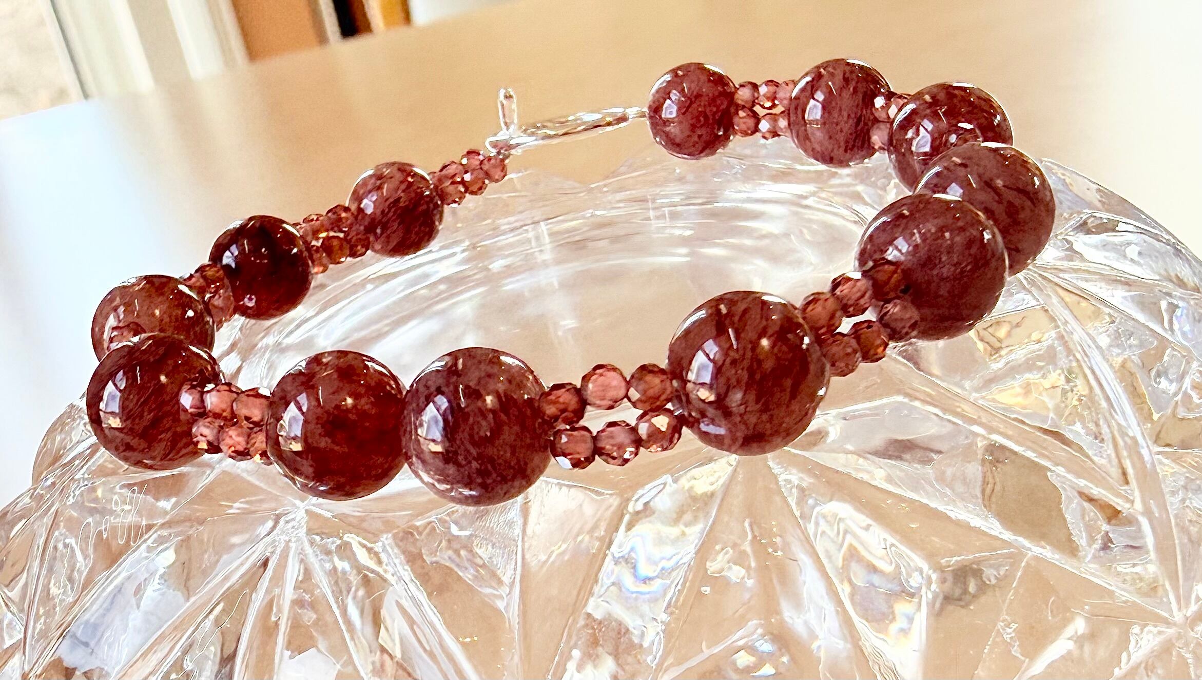 繊細にきらめく小粒ガーネットと、存在感のあるモスコバイトが絶妙なバランスで、手元を女性らしく華やかに演出します。