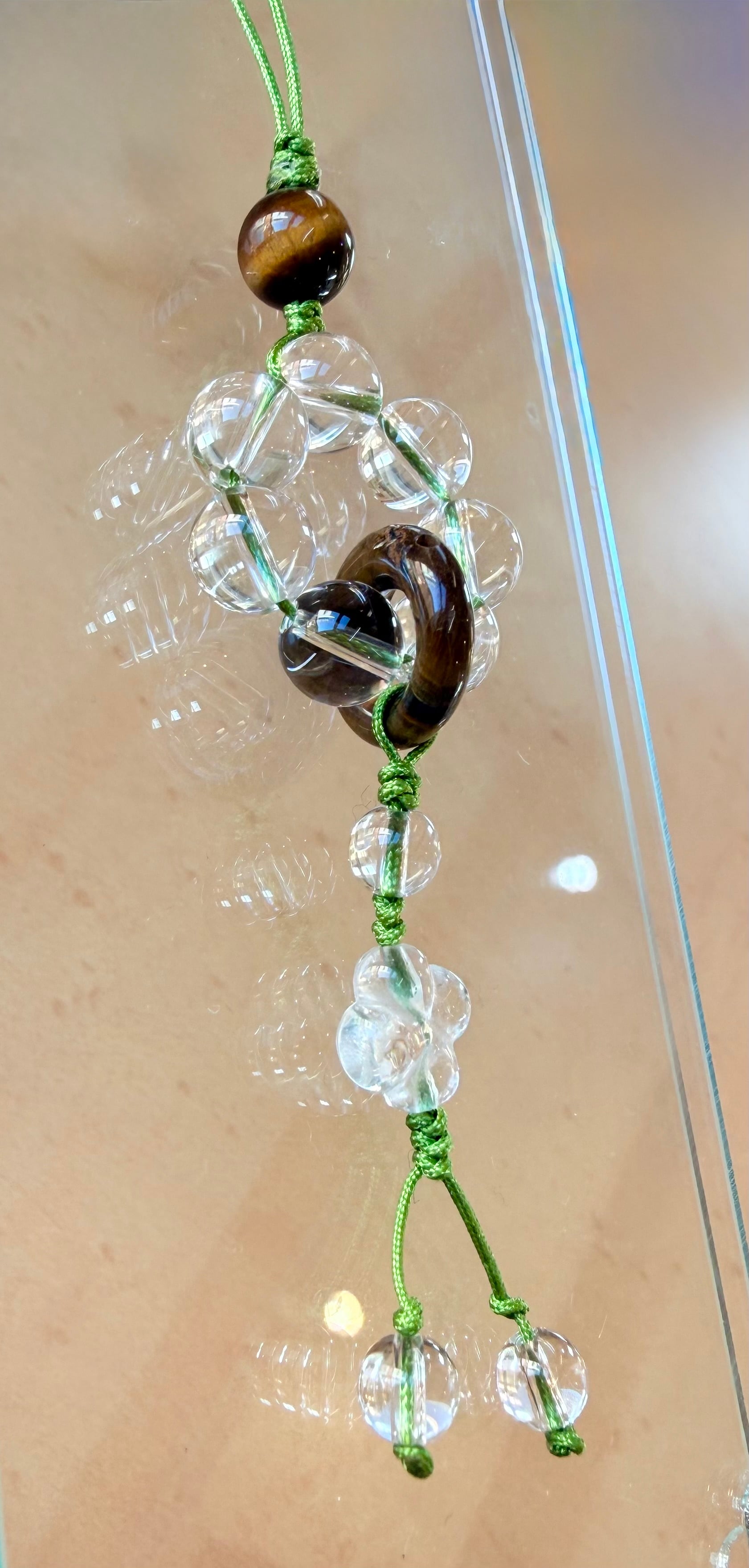 透明感あふれる水晶と、力強いタイガーアイを組み合わせた、縁起の良いお守りストラップ。