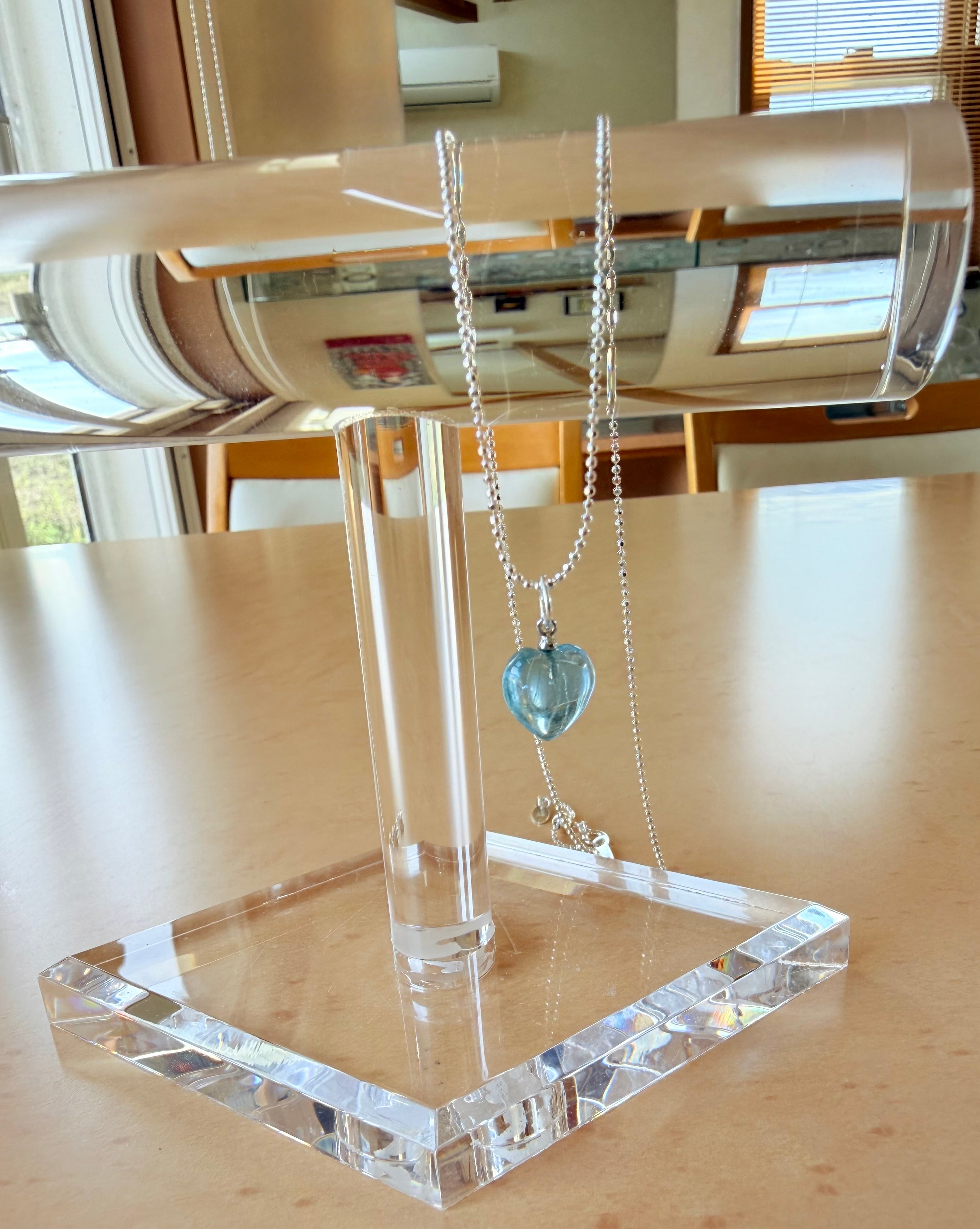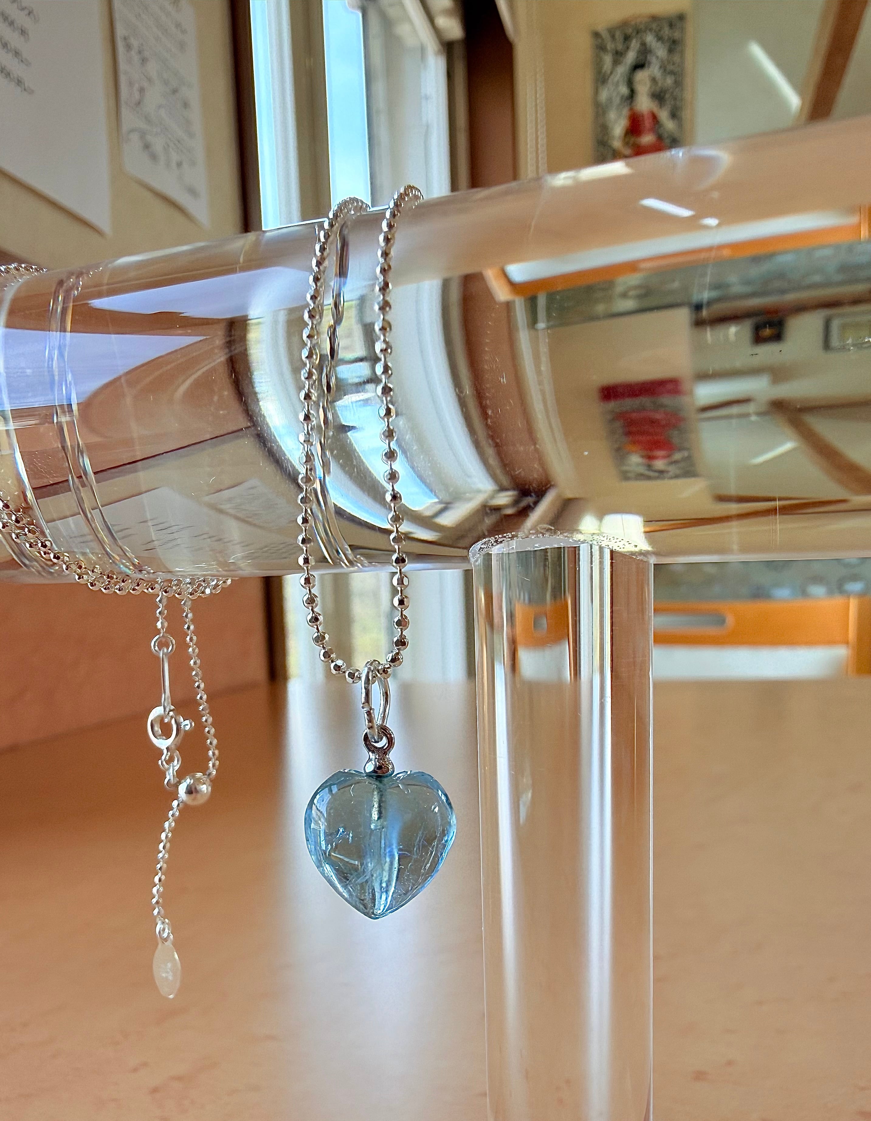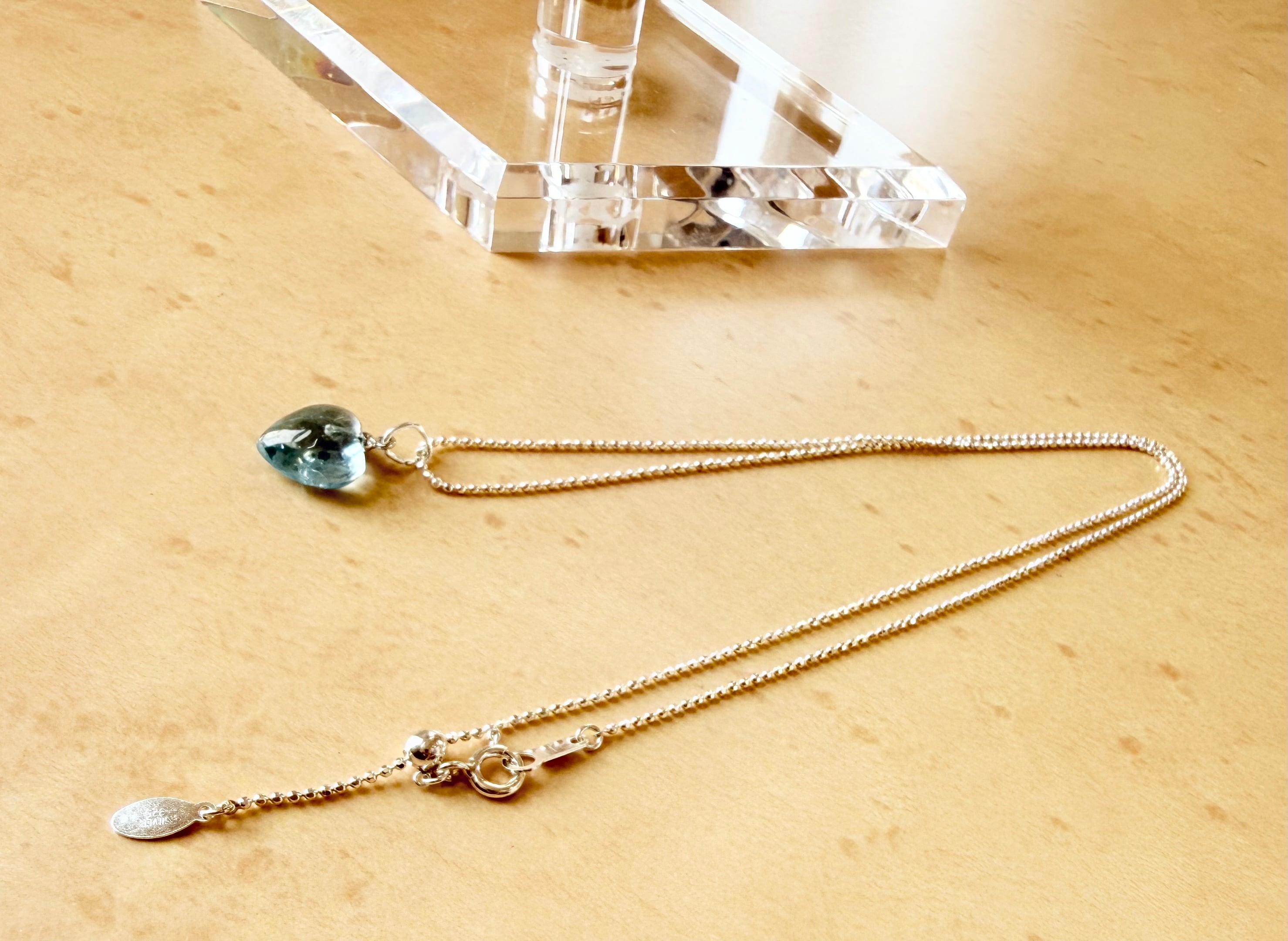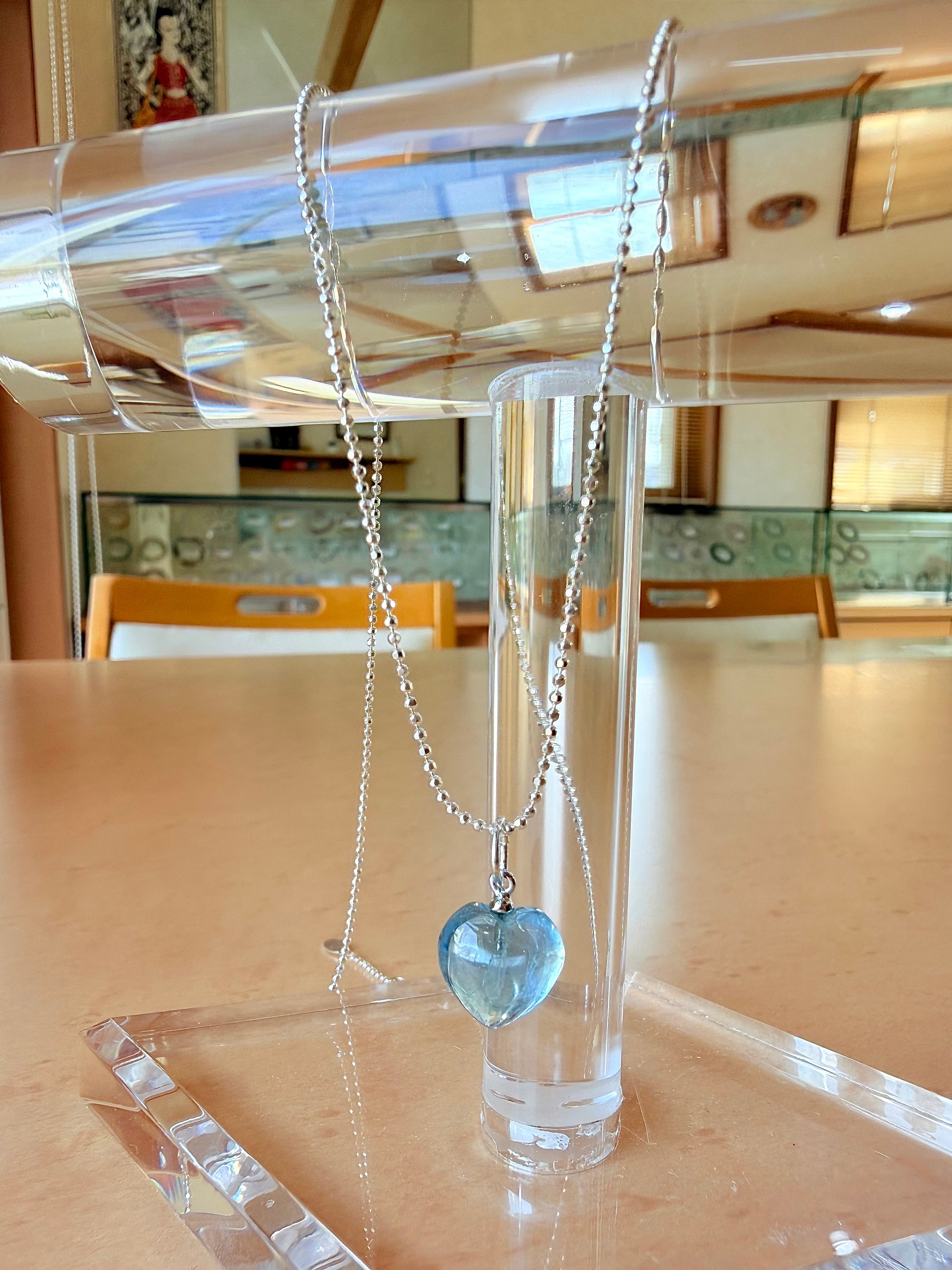 澄んだ海のような輝きを持つアクアマリンを、優しいハート型に仕上げた手作りネックレス。