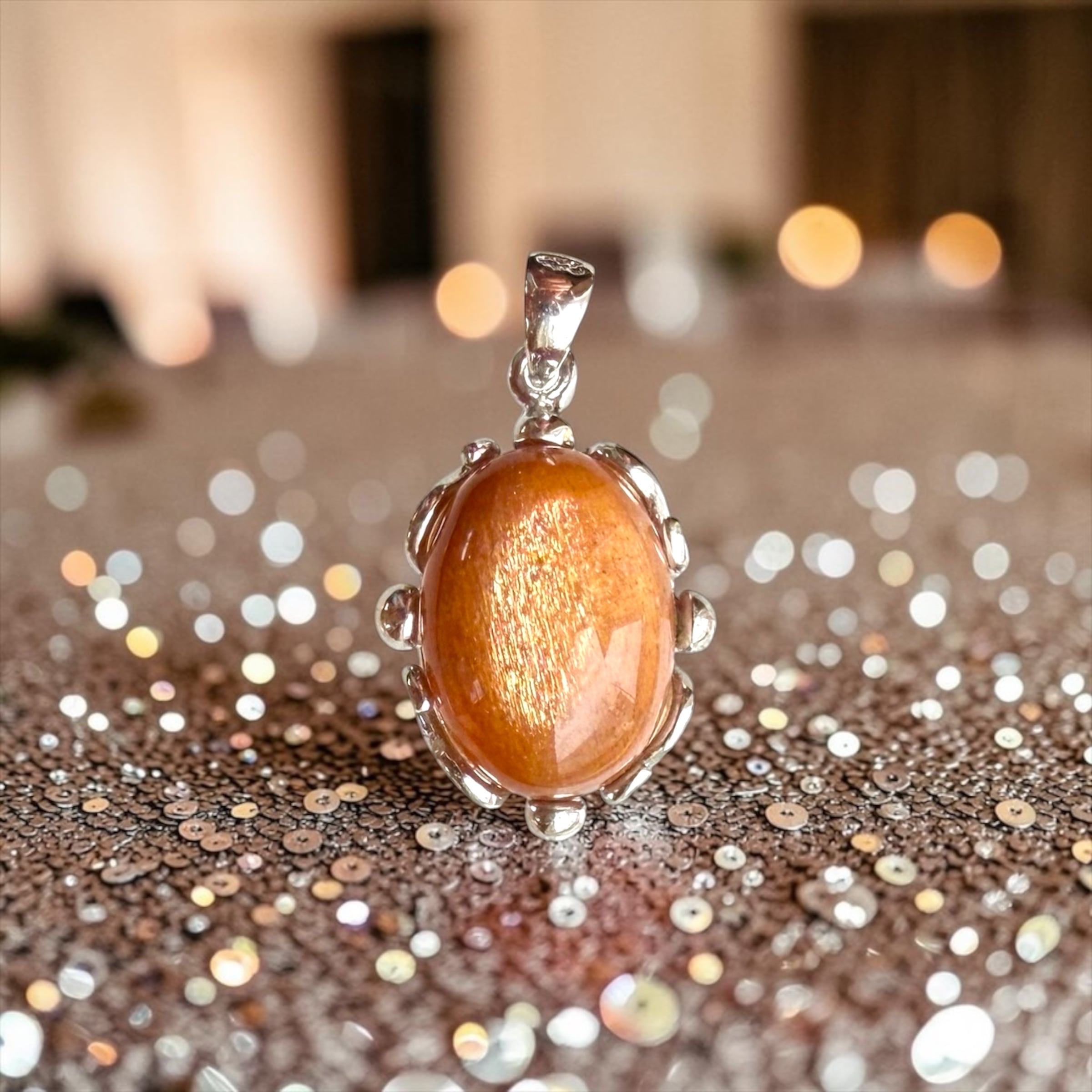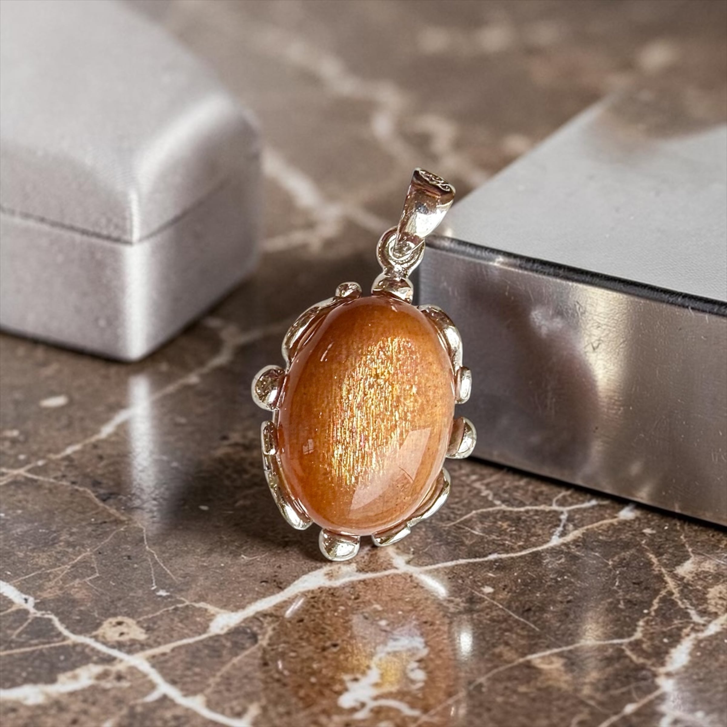 高品質サンストーン✨温かみのある茶➕オレンジカラーに、内側から輝くようなシラーが美しいサンストーンのペンダント。