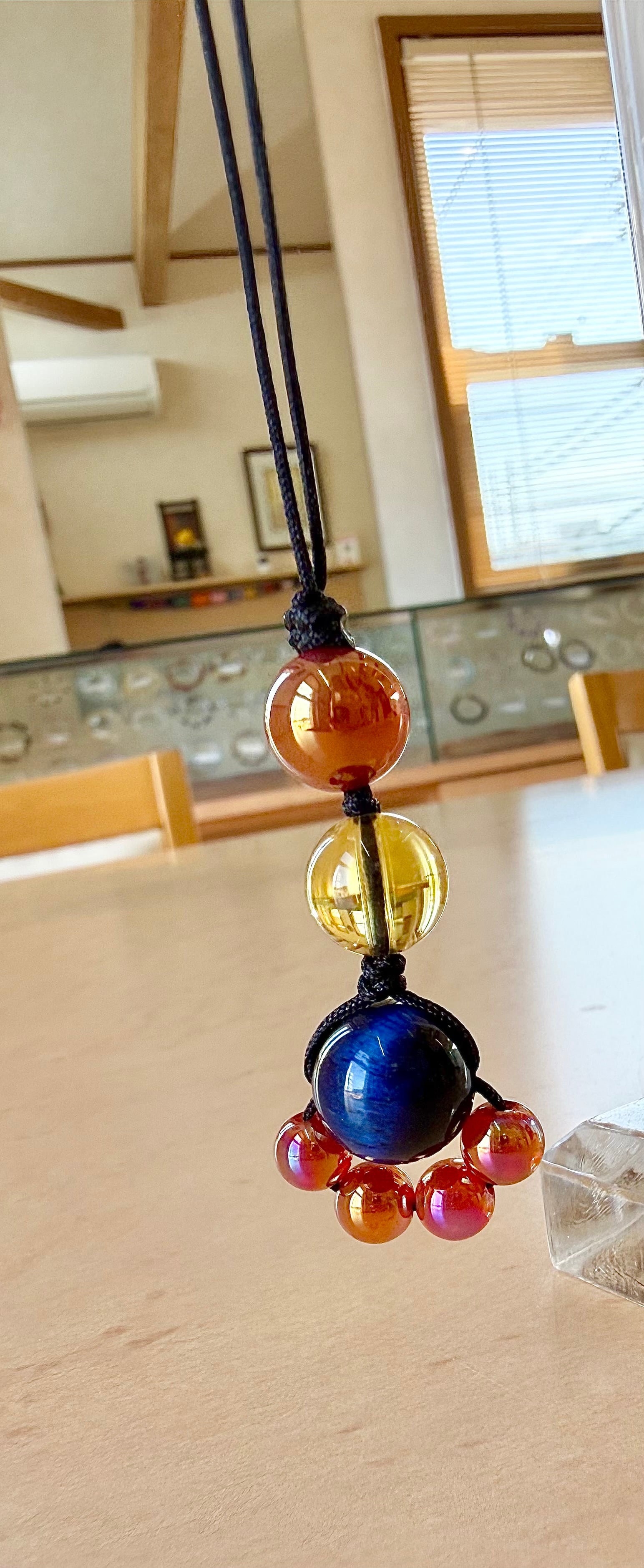 中心には深い輝きを持つブルータイガーアイを配置し、周りを赤瑪瑙オーラが肉球のように囲むデザイン。上部にはシトリンを組み合わせ、明るく前向きなエネルギーをプラスしています。