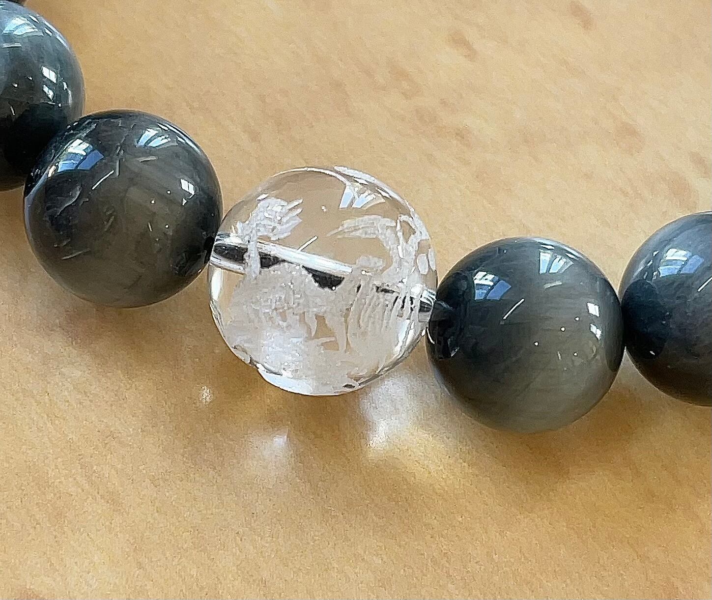石: ホークスアイ(鷹目石)12mm.龍彫る水晶14mm