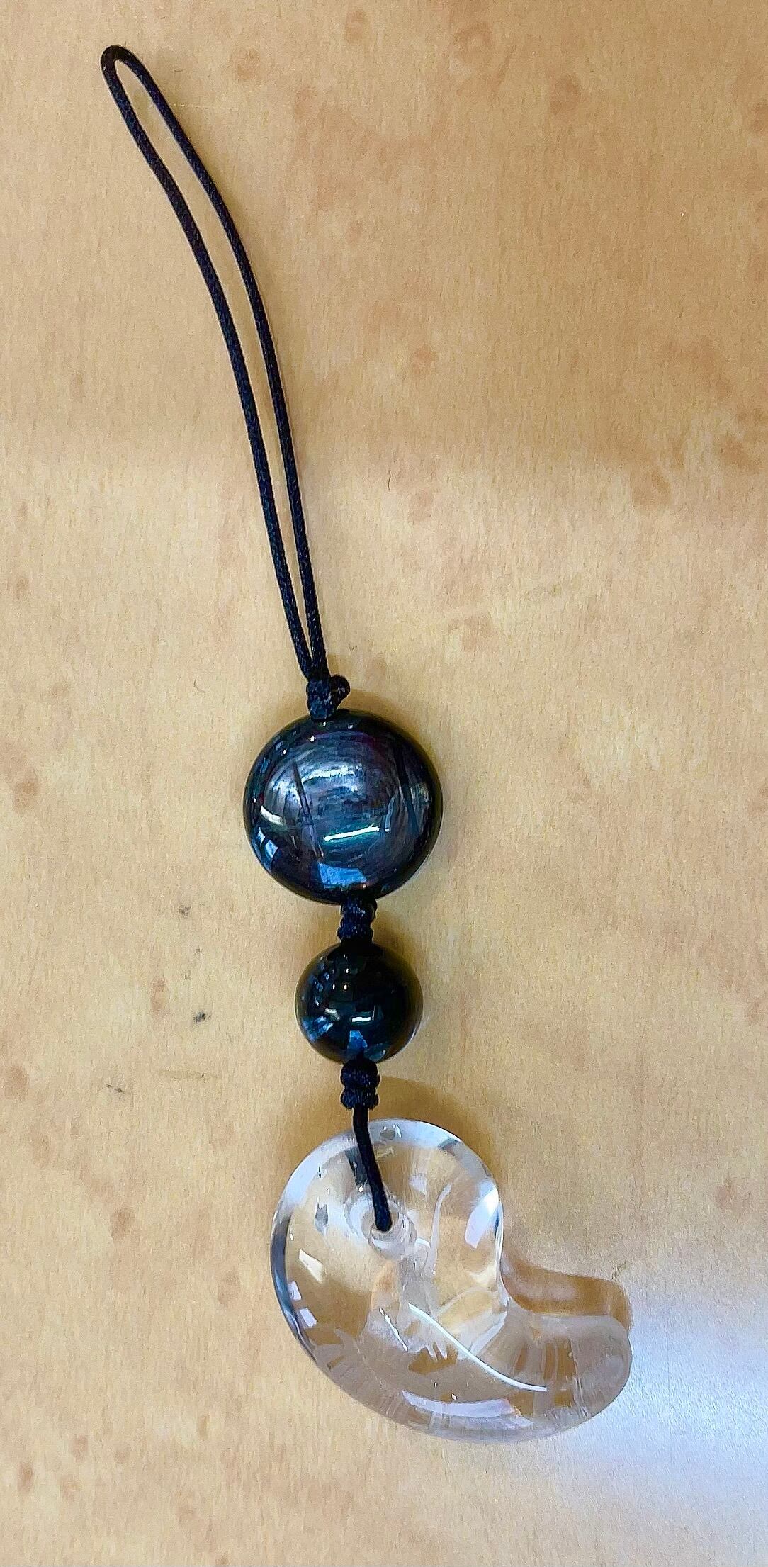 鮮やかな水晶の輝きを纏った、勾玉龍彫る輝石(ハイパーシーン)ストラップ。その美しさは非常に目を引き、身につけることでパワフルなエネルギーを感じることができます。また、勇気やパワーを象徴しています。持ち主に運勢をアップさせ、魔除けに。