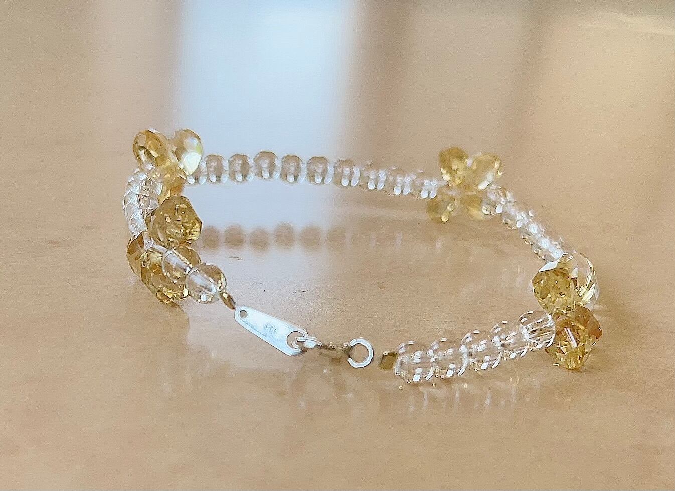 高品質シトリンは商売運や財運をアップさせ、困難や壁を乗り越え、幸運を招く、ストレスの解消、心の安定に。高品質カットシトリン四個使って花の型に作りました、ギラギラして、とても上品でかわいいブレスです。