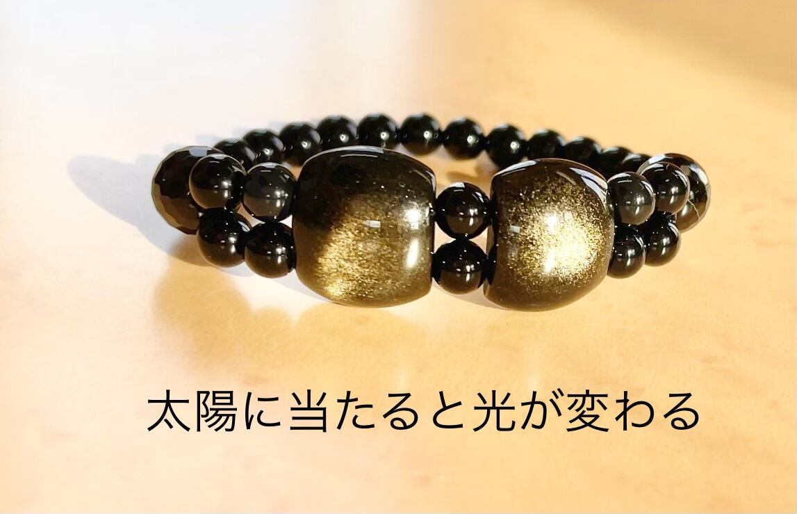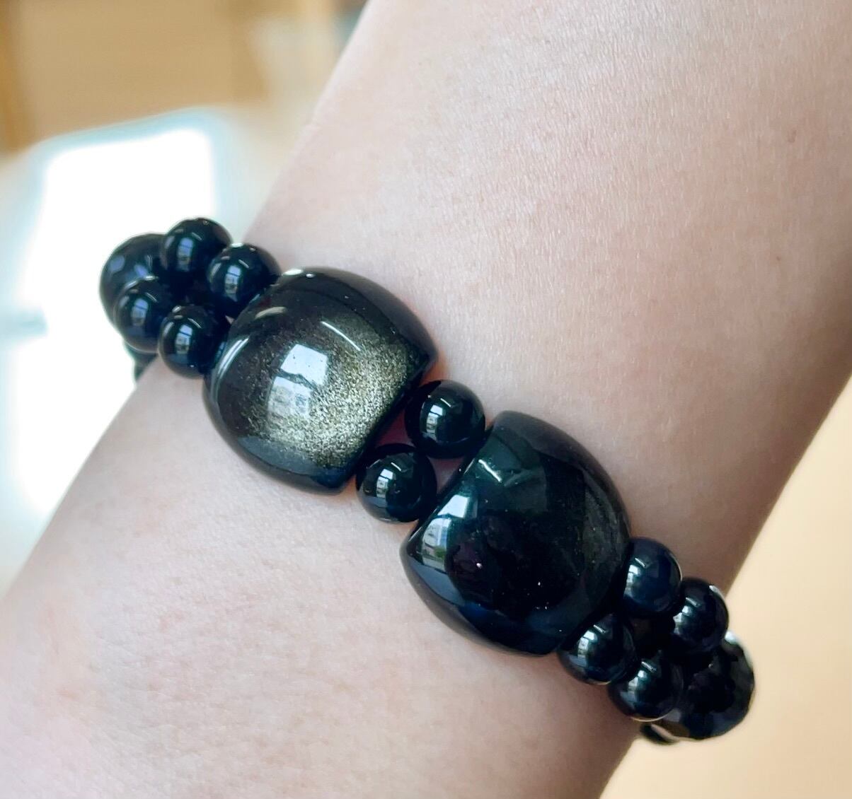 石の意味: オブシディアンは、心の乱れを取り除き、内面の強さを引き出す石と言われています。その特性から、ストレスやネガティブエネルギーを洗い流し、冷静な判断力を保つ手助けをすると伝えられています。また、オニキスは、持つ人に自信を与え、意志を強固にするとともに、感情の安定をもたらす力があるとされています。トルマリンは、身体に必要なエネルギーを補充し、心と体を調和させる効果があるとされ、ポジティブな思考を促進します。 このブレスレットは、日常生活で感じるストレスや不安から解放されたい方、前向きに進みたい方にぴったりです。石たちの力を借りて、心の安らぎや自信を得ることができるでしょう。